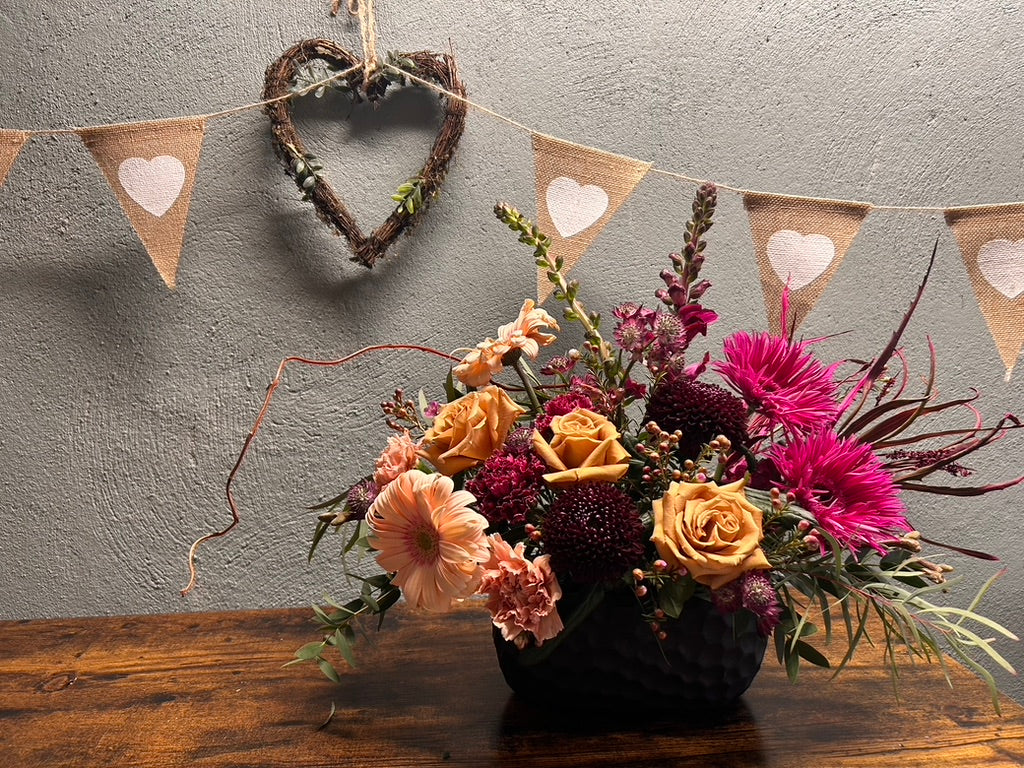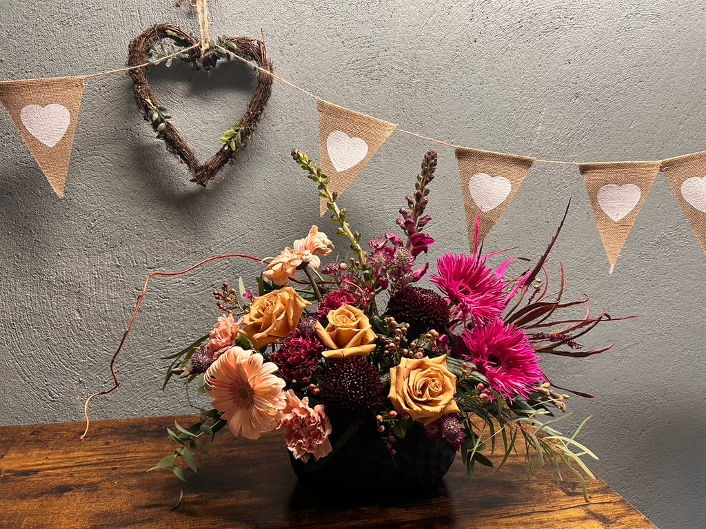 A bold and flirtatious Valentine arrangement bursting with exotic blooms, rich pinks and warm caramel tones. Designed with natural movement and untamed texture, this is a modern alternative to traditional red roses — expressive, romantic and irresistibly wild.